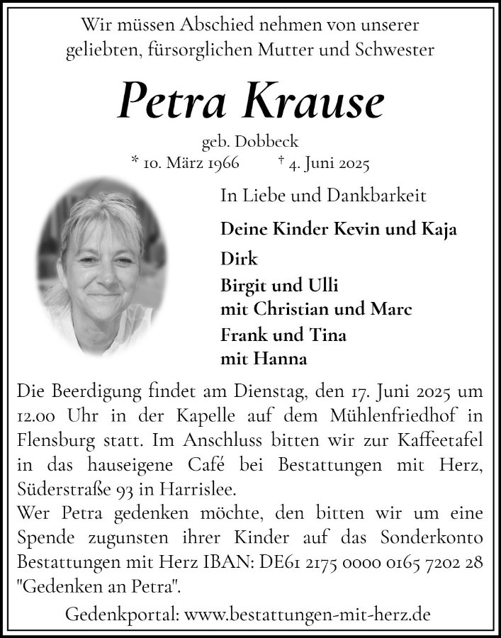 Meine Familie und ich vermissen dich - wir werden dich immer mit uns nehmen. Danke Oma/Tante Petra
